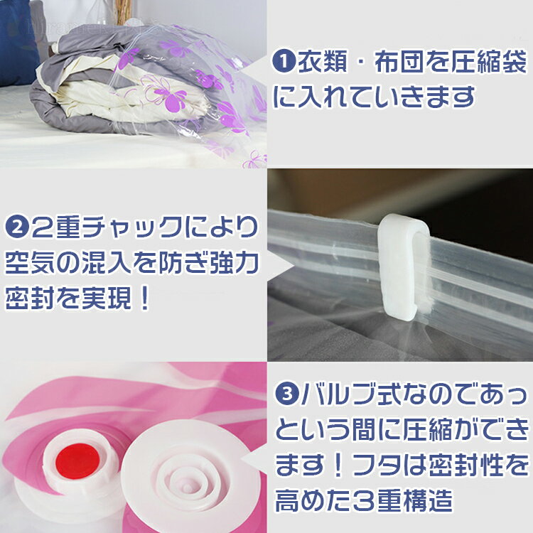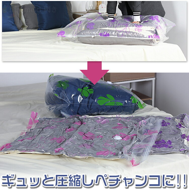【送料無料】 3重構造バルブ式 圧縮袋 花柄 スライダー付き【真空バック 日用品 布団 毛布 マット 雑貨 衣類 2重チャック 二重 密封 収納 整理整頓 インテリア 清潔 衛生】