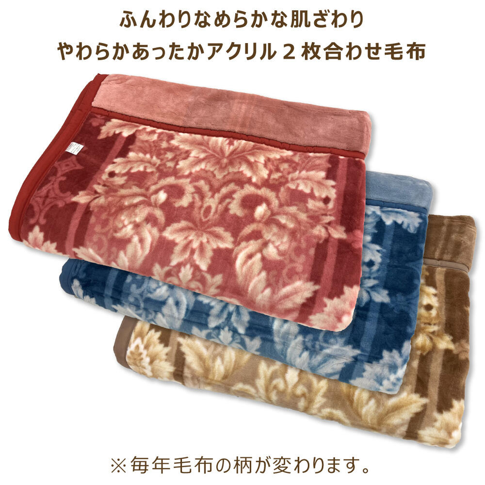 商品詳細 サイズ シングル:140×200cm パイル糸 アクリル100% 地糸 ポリエステル100% 重量 約2.5kg カラー 1.花柄ワインレッド 2.花柄ネイビー 3.王朝ピンク 4.王朝ブルー 5.ペイズリーワインレッド 6.ペイズリーネイビー 製造国 日本製 特徴 アクリル100%2枚合わせなのであたたかい ふとんと相性がよくすべりにくい 綿ふとんや合繊ふとんをお使いの方におすすめ ご家庭で丸洗いできます 注意 お使いのスマートフォンやパソコンのモニターの発色具合によって、実際のものと色が異なる場合がございます。